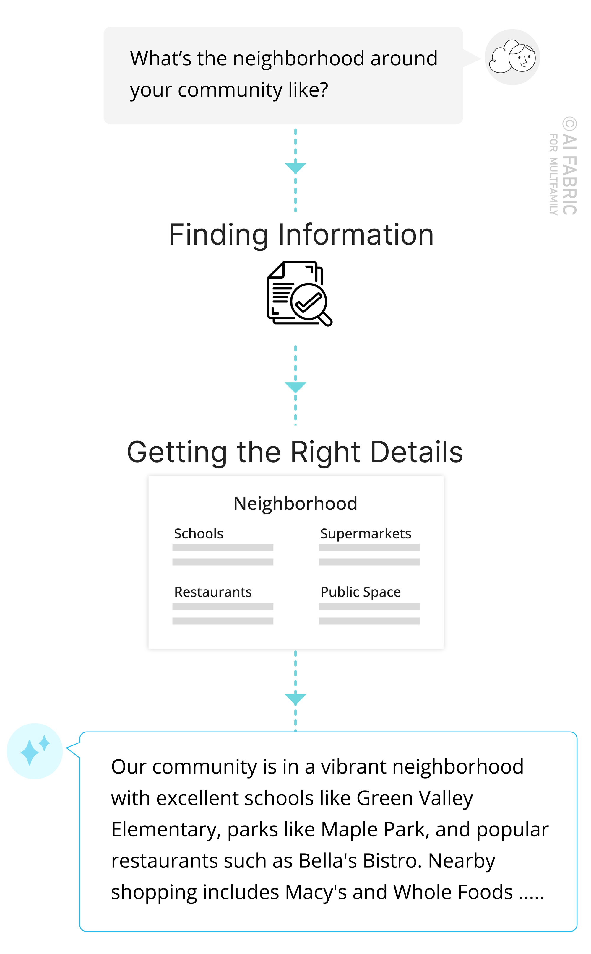 Imagine you're managing a multifamily property, and a prospect asks your AI chatbot, "Can you tell me about the neighborhood around your community?" By leveraging RAG, the chatbot can provide precise and factual responses.