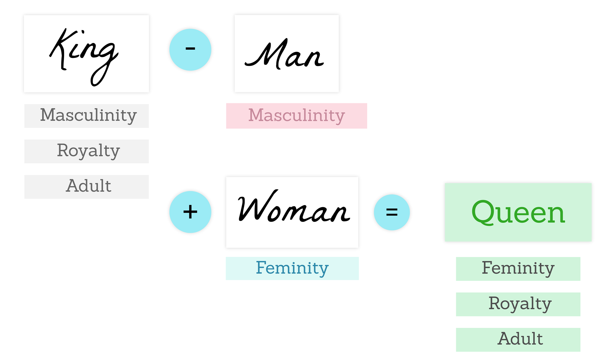 - The result, "queen," merges the ideas of royalty and femininity, just as predicted by embeddings.