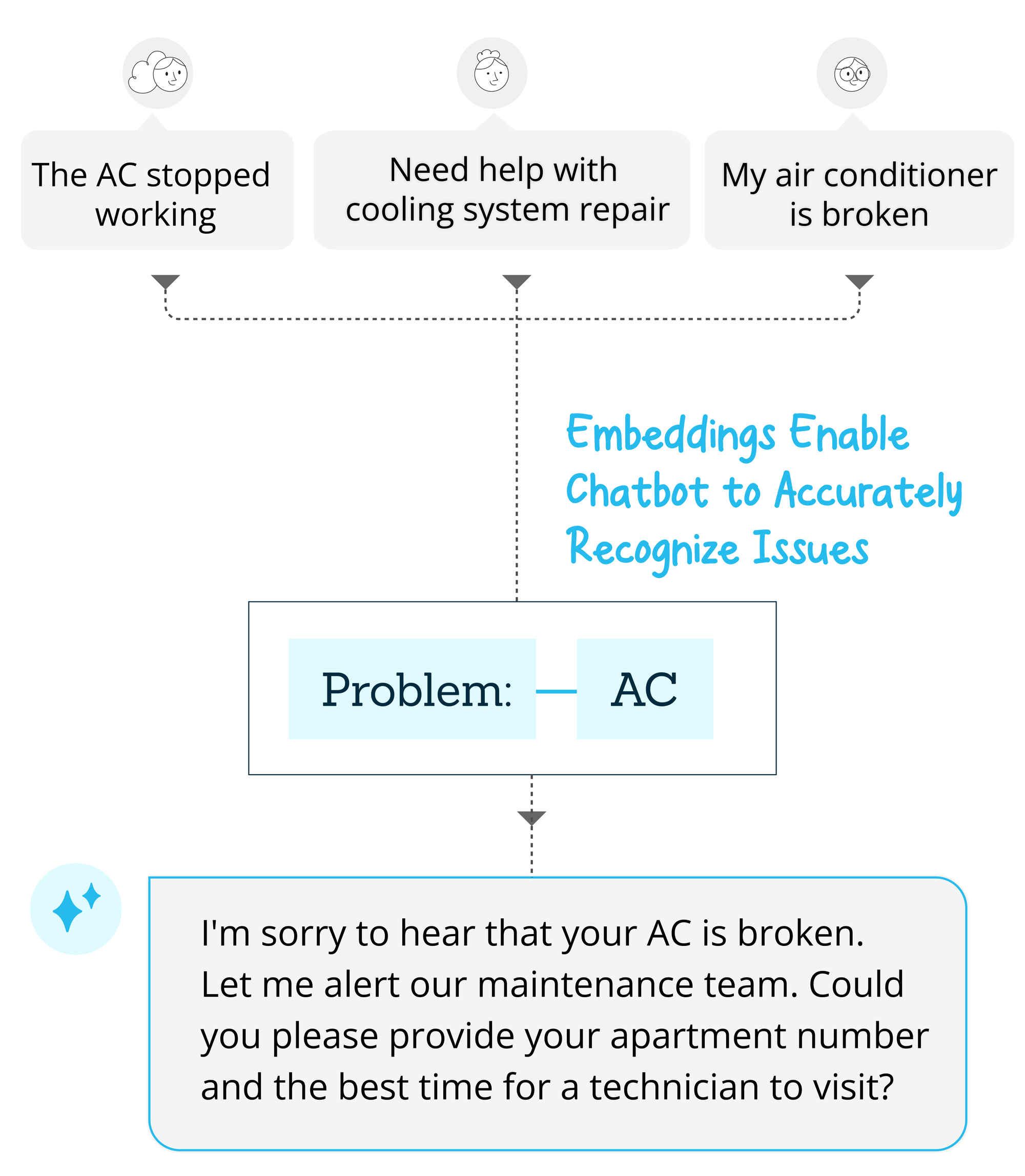 Embeddings help the AI recognize that these different phrases all refer to the same issue: air conditioning problems. It achieves this by converting the phrases into numerical vectors, which allows the AI to see the similarity in context and content among these different statements.
