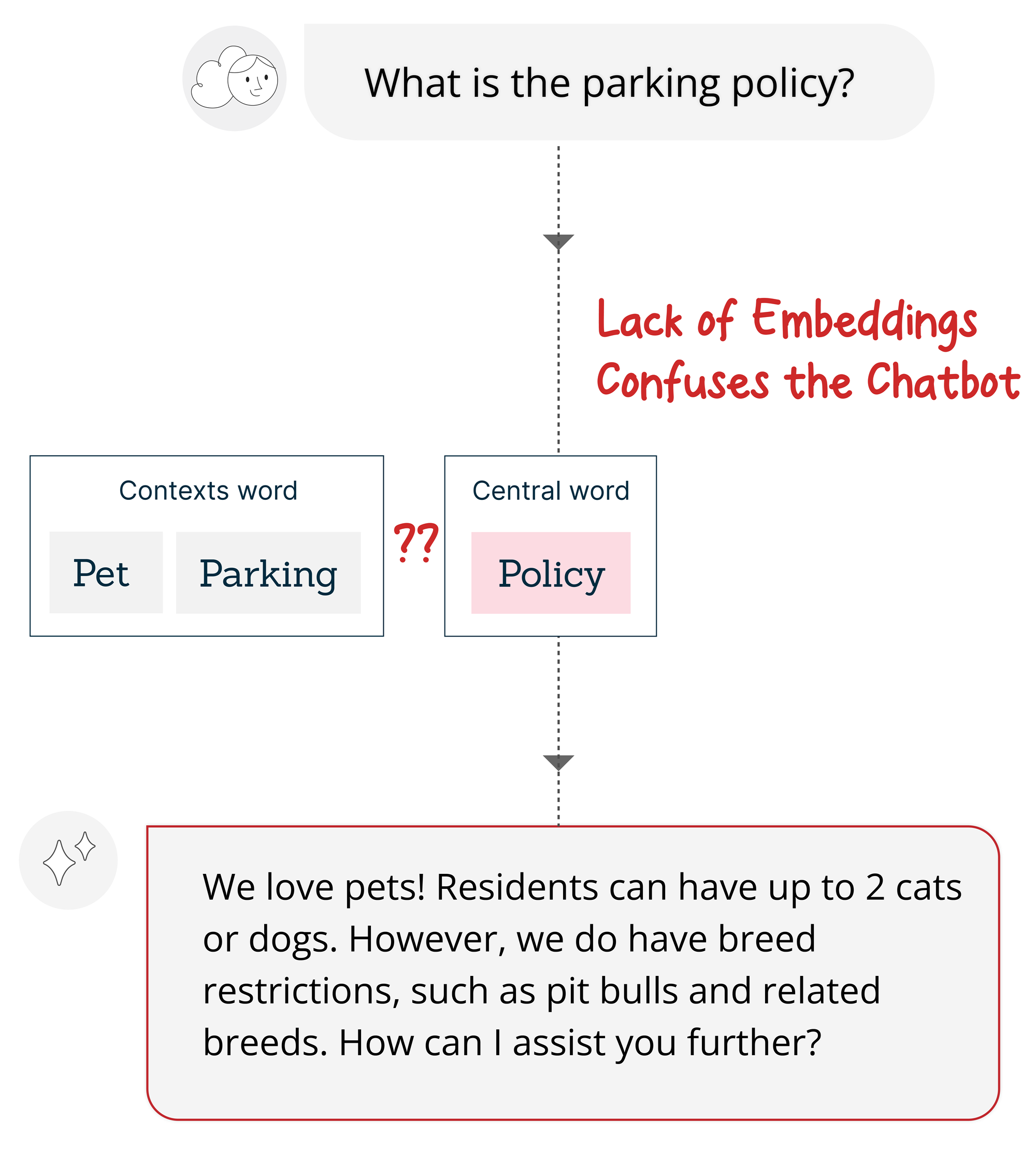 Without embeddings, this chatbot might easily mix up inquiries due to its inability to understand context. For instance, if a prospect asks about the "parking policy," the chatbot, focusing solely on the common keyword "policy," might mistakenly provide information about the "pet policy" instead.